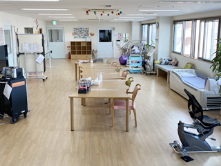 明るい日差しが差し込む東側の窓 木目とパステルカラーの家具 新しく広々としたデイルームで、ゆっくり過ごしていただきたいと思います。