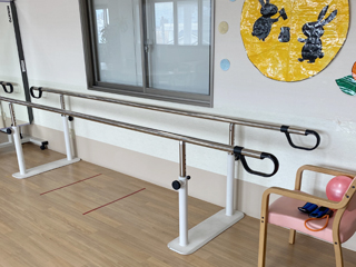 両手に手すりがあり、安定しているので安心して歩行練習ができます。 また、立ち上がりや、片足立ちなど立位での運動にも利用しています。