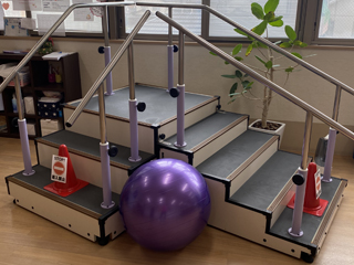 階段は両手に手すりがあり、2種類の高さの段差を選んでトレーニングできます。また、踏み台昇降運動も行っています。
